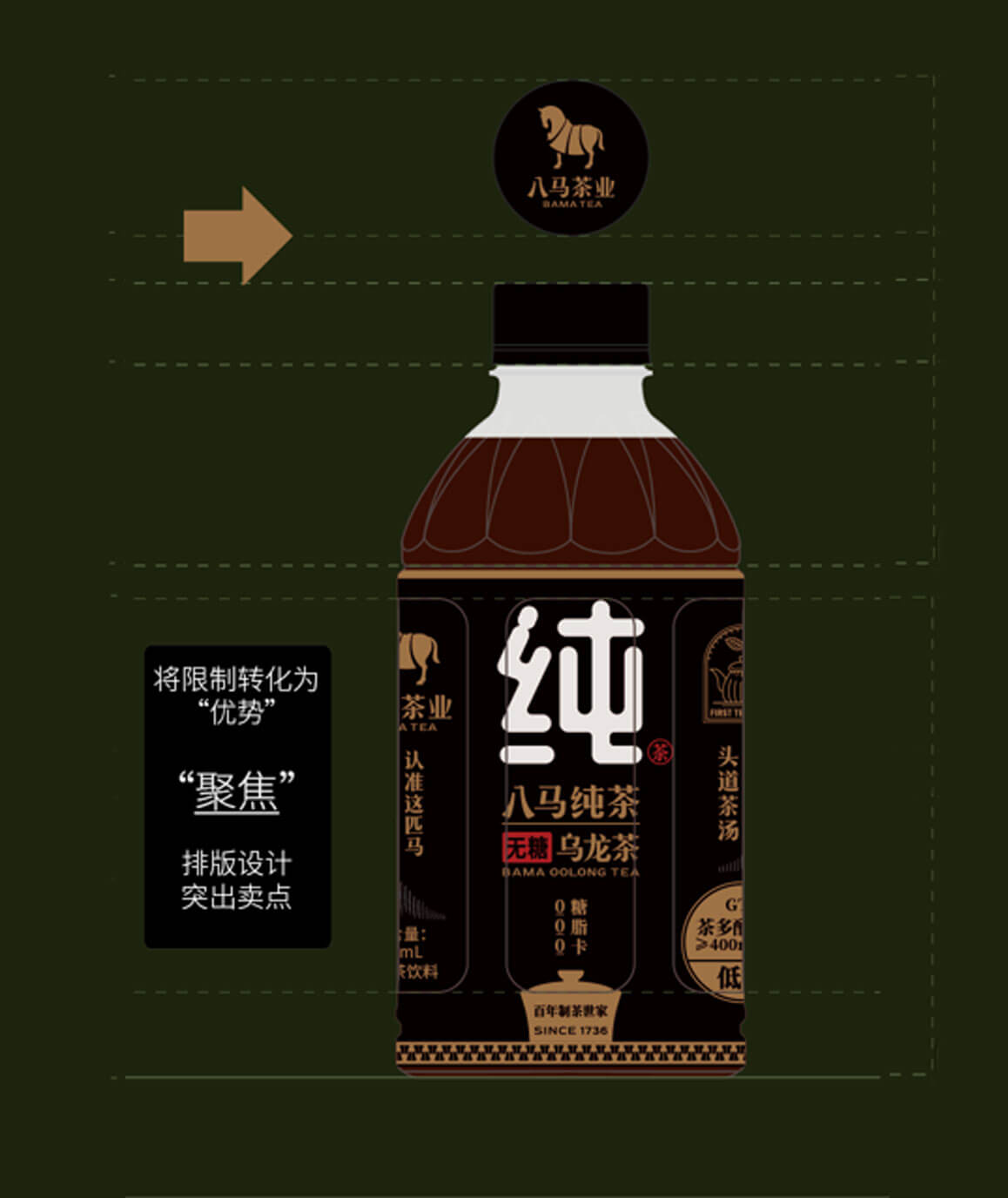 從瓶型到外觀的設(shè)計(jì)八馬純茶飲料都與“中國茶”的契合調(diào)性高級(jí)質(zhì)感的整體色調(diào)讓這一瓶茶更“純醒目的“純”字讓人眼前一亮中國茶元素細(xì)節(jié)的融入使這一系列有了濃濃的中國味道
