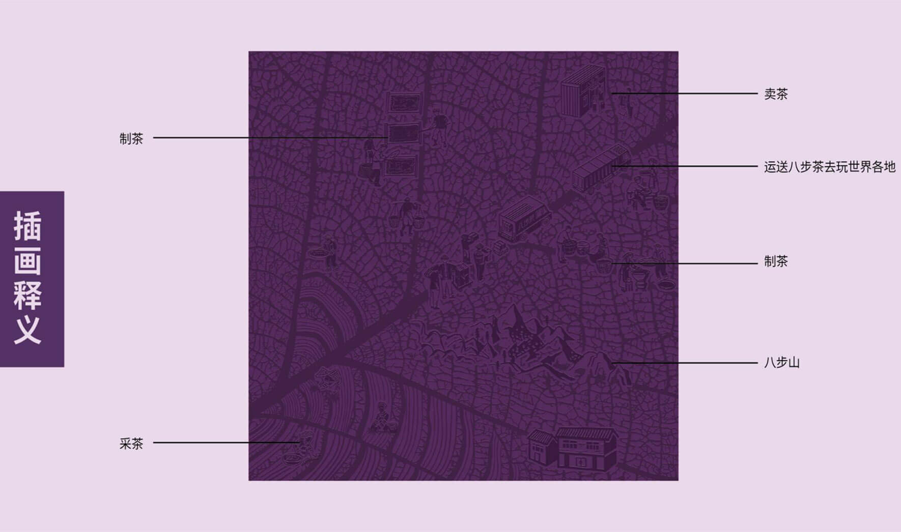 茶園、采茶、制茶、賣茶、八步山等場景以葉脈為載體,表達(dá)畫面的延展性,