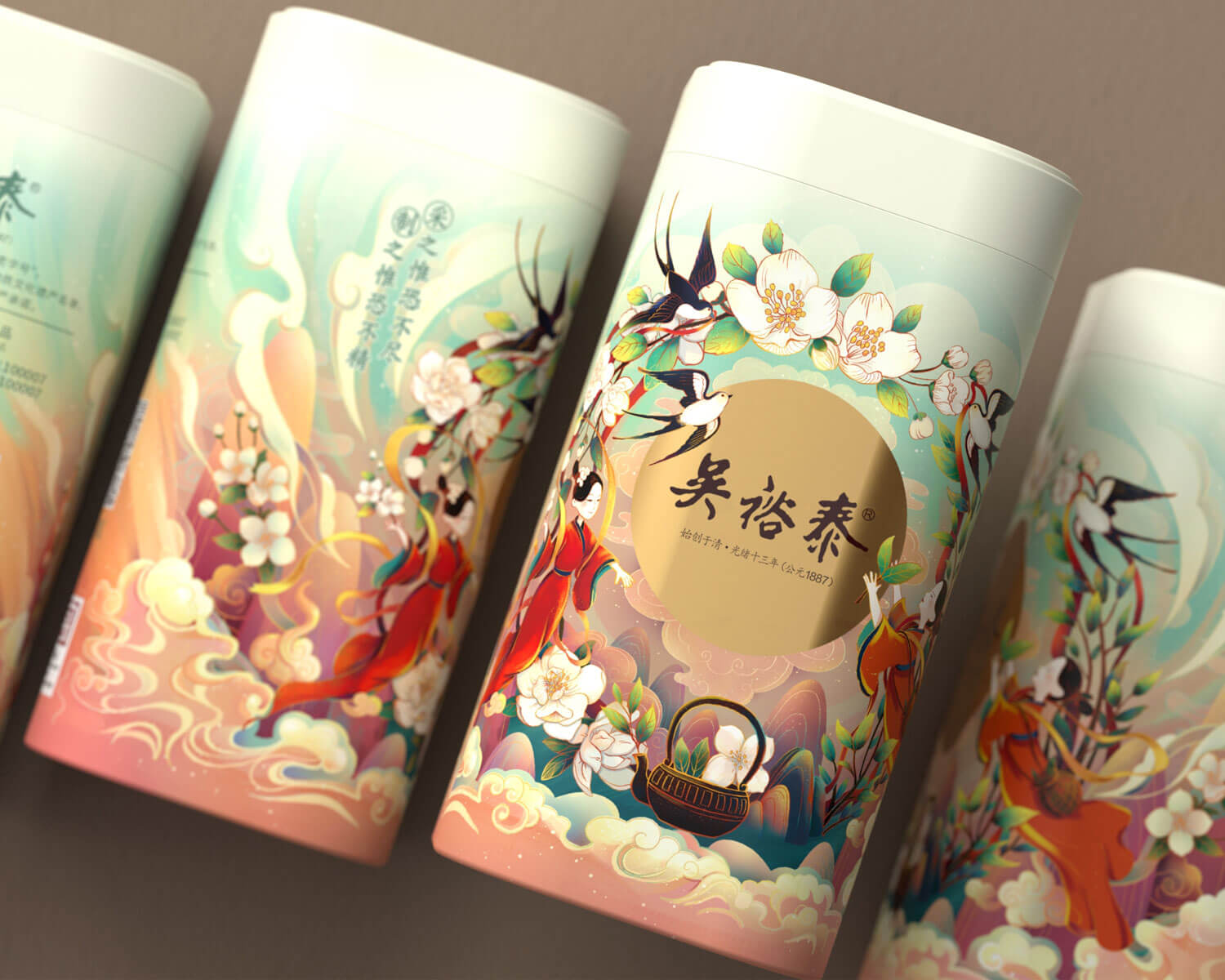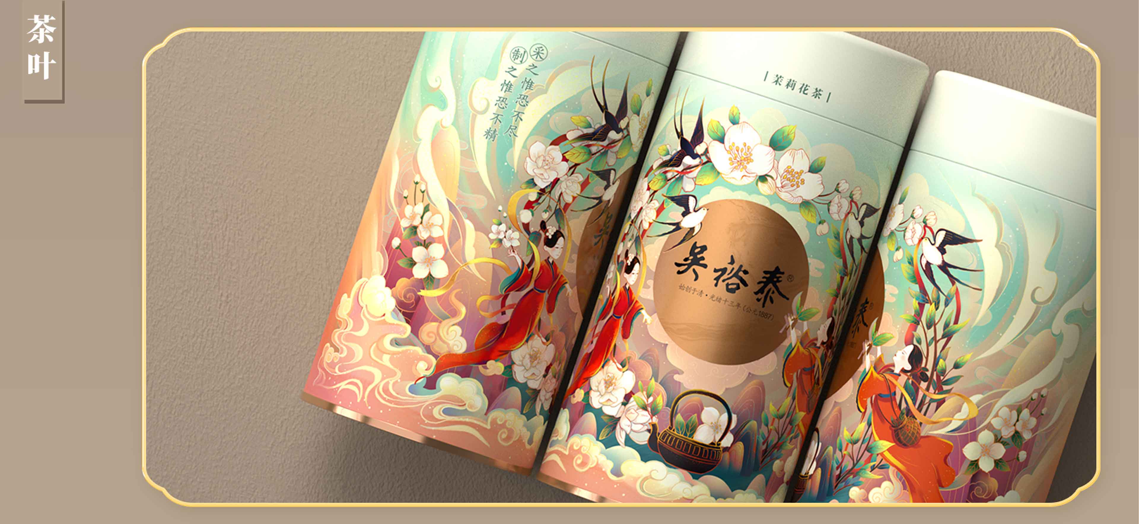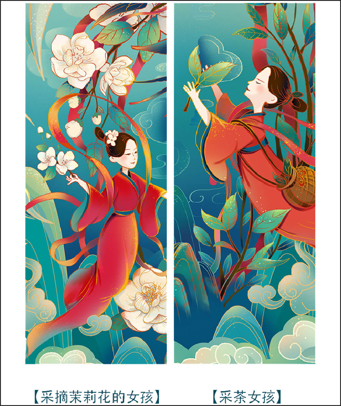 以“茉莉花”為主題元素,進(jìn)行設(shè)計(jì)創(chuàng)作,以國潮風(fēng)格為基調(diào),輔助山川、流水、茶葉、采茶姑娘、燕子等元素,賦予插畫更多的故事性和閱讀性。