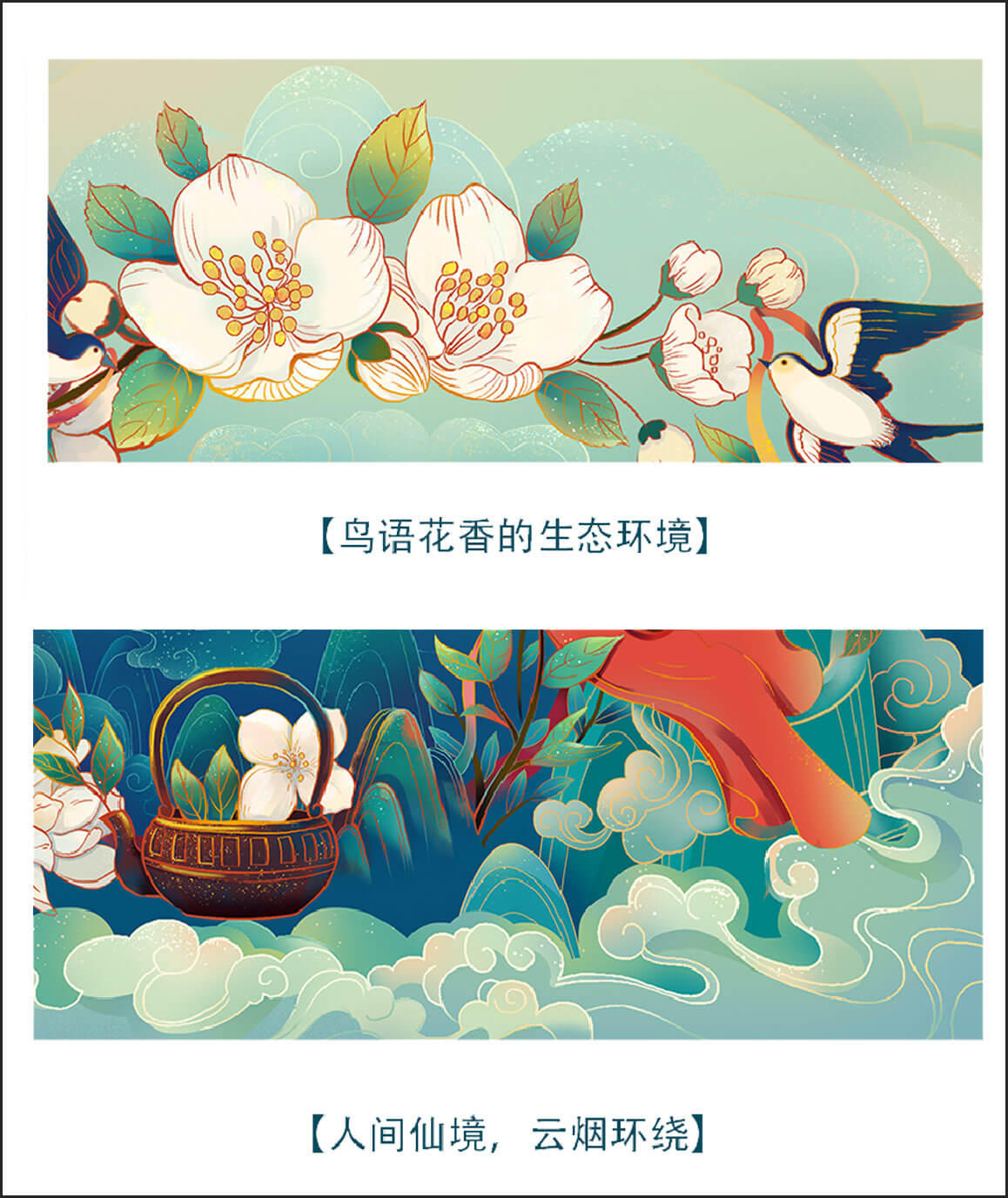 插畫以新國潮風(fēng)格繪制畫面描繪了“云煙環(huán)繞、鳥語花香"的生態(tài)環(huán)境里采茶與采花的女孩。