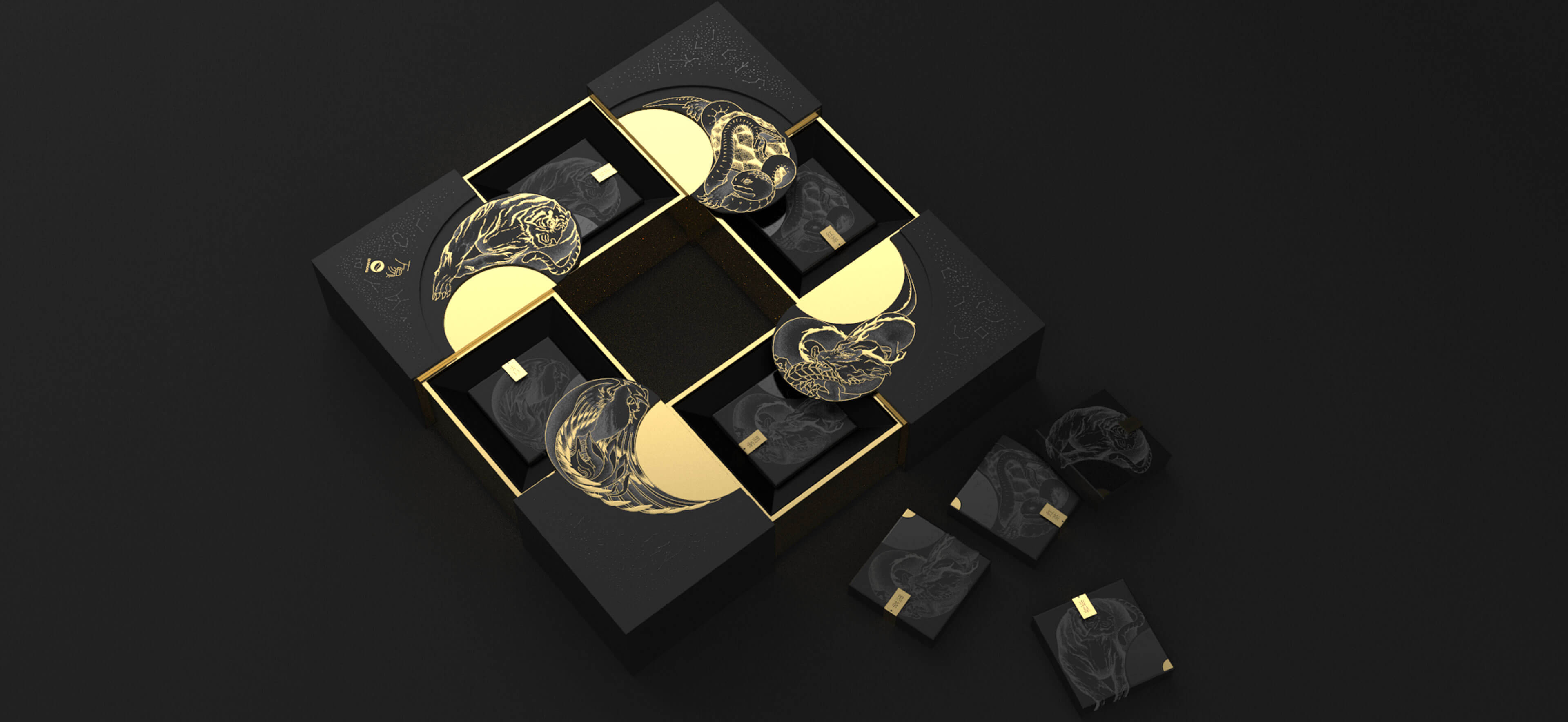 在中國傳統(tǒng)文化中,古人懷著對星空的敬畏及信仰,將天空分成東、西、南、北,用青龍、白虎、朱雀、玄武作為其守護神獸,此為“四象”。因此,在此款產(chǎn)品的創(chuàng)作過程中,