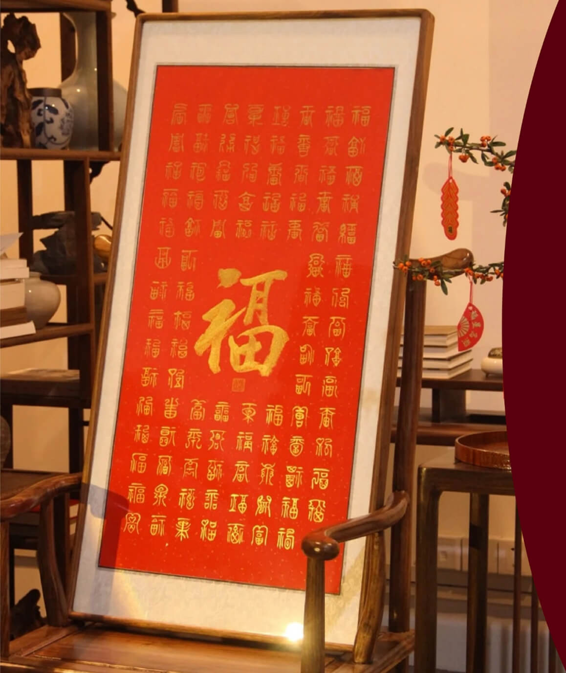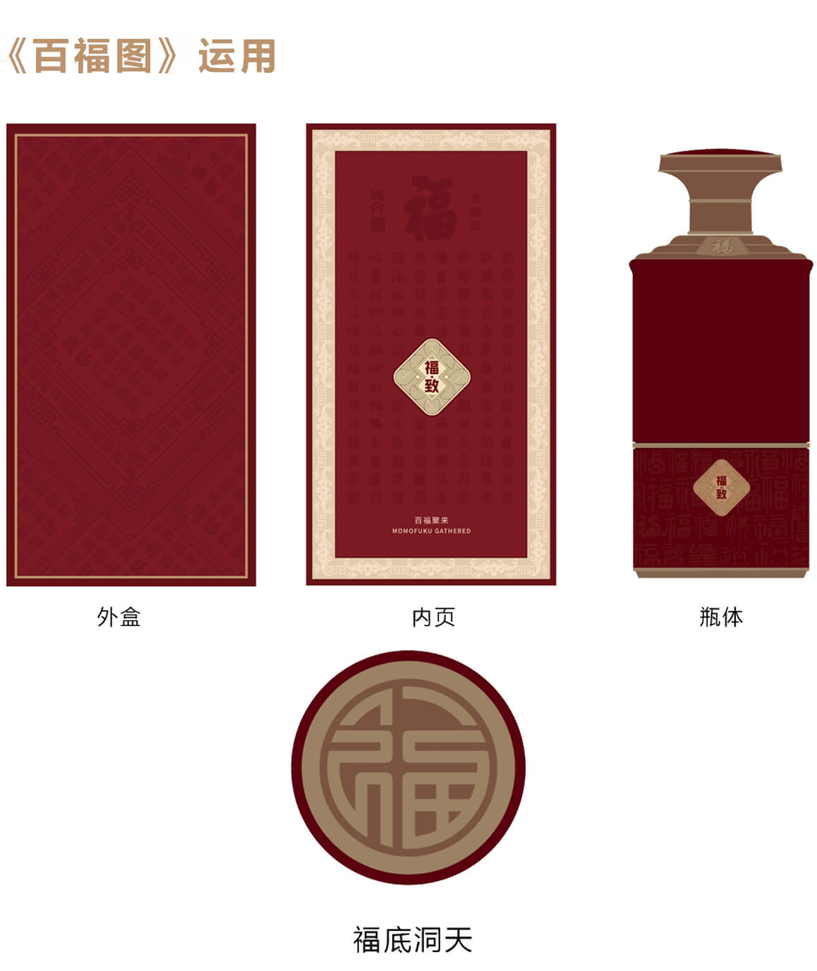 《百福圖》1、以“百?!睘樵O(shè)計(jì)元素,百字百體,字體造型穩(wěn)重、均齊,端莊,極有意趣和韻味。2、一百個(gè)不同字體的“?!弊郑瑸閺V大中國(guó)勞動(dòng)人民所喜愛(ài),寓意百福環(huán)繞,福氣綿延,福氣滿盈,同時(shí)也象征福滿天下。3、用“百福”元素來(lái)打造“福致”外包裝,讓福落我家。