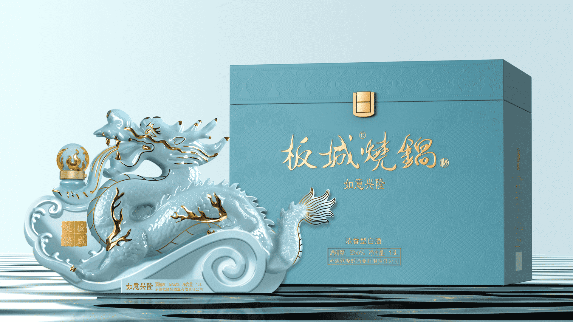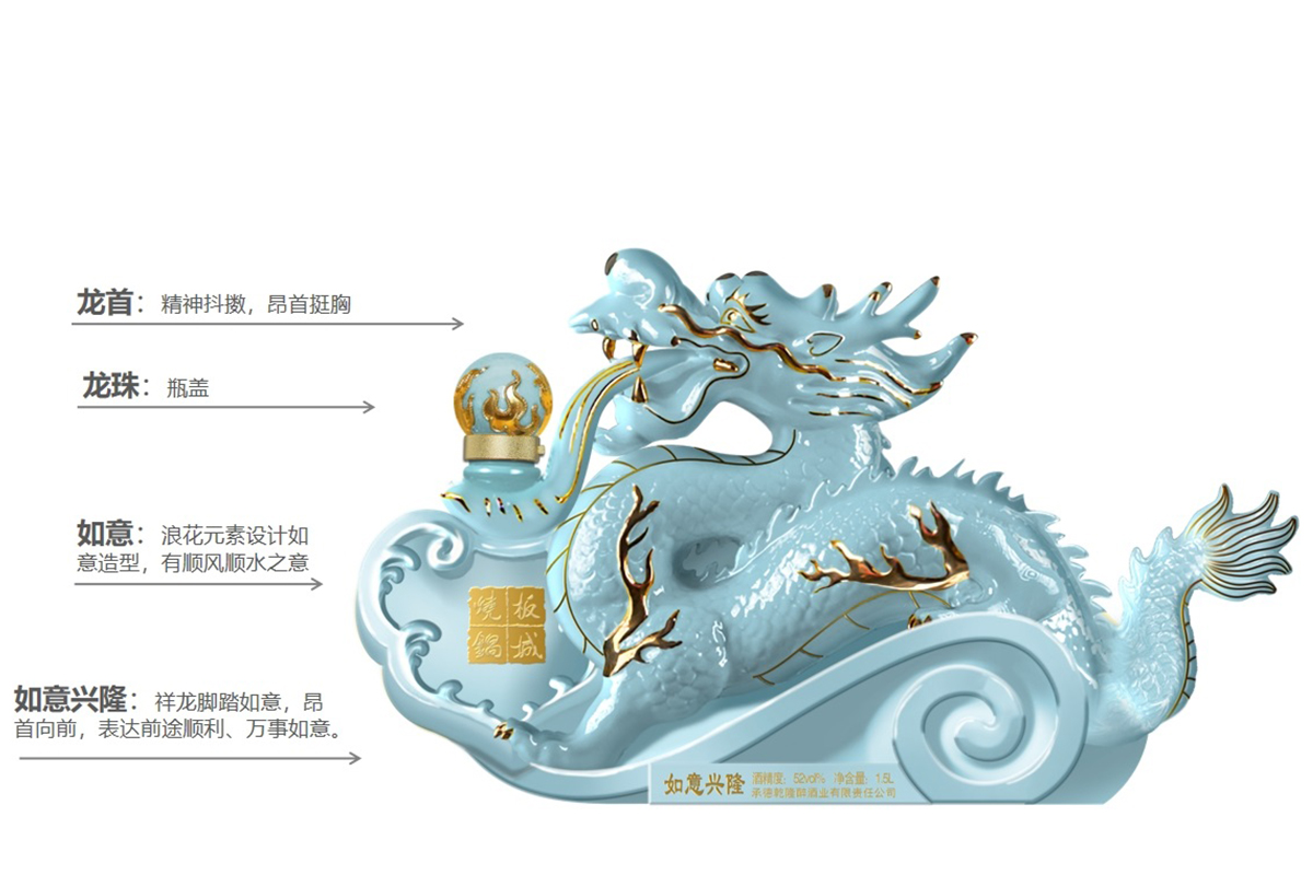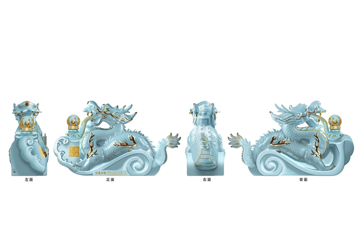 純凈柔和的天青色+典雅的金色,以珍貴的汝窯天青色來(lái)塑造板城龍年生肖酒的珍貴性,收藏性。