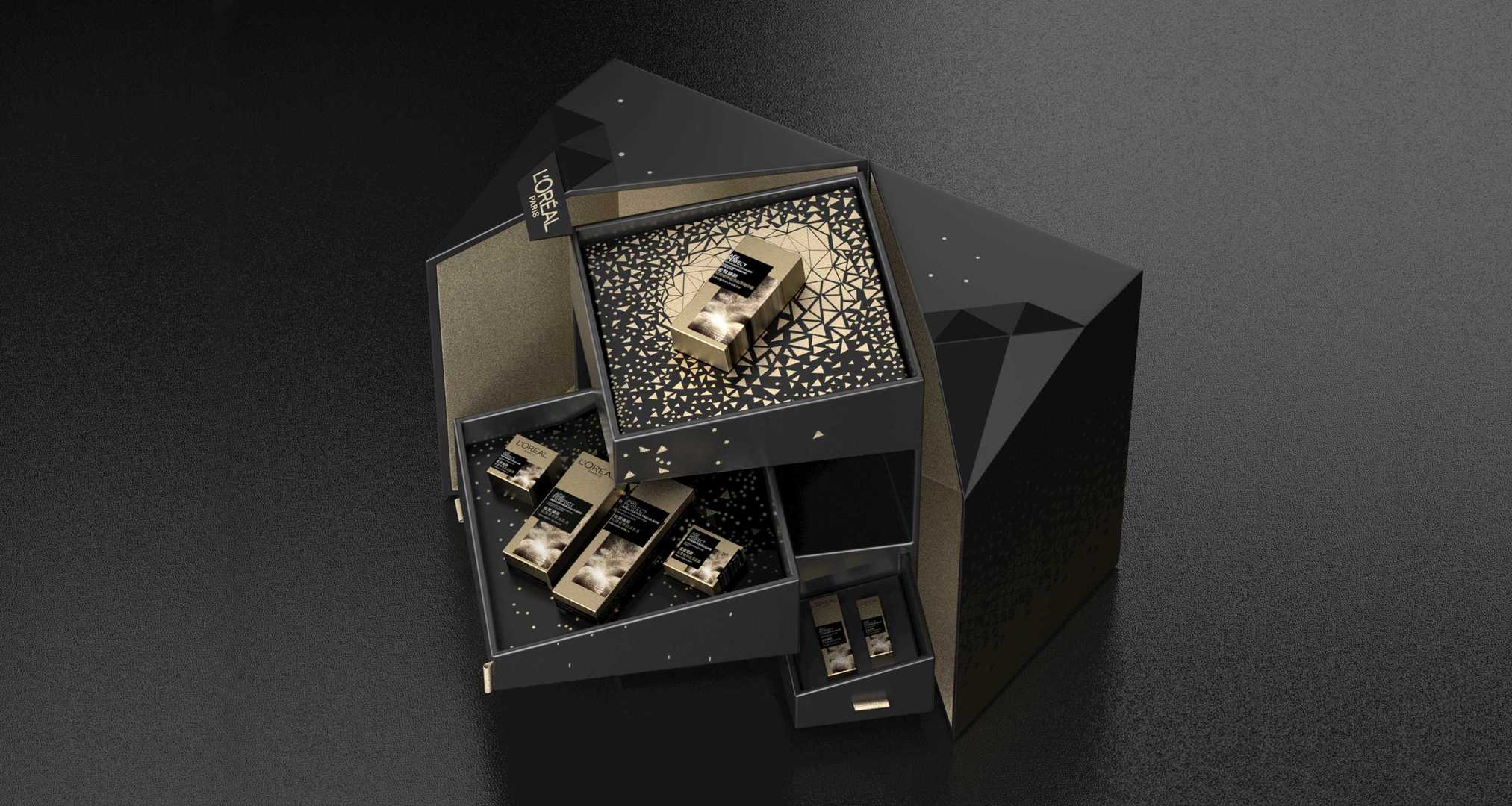 包裝結構靈感來自鉆石,將鉆石的切割運用在包裝上,同時打開包裝,俯視效果為鉆石型,專屬性更強。