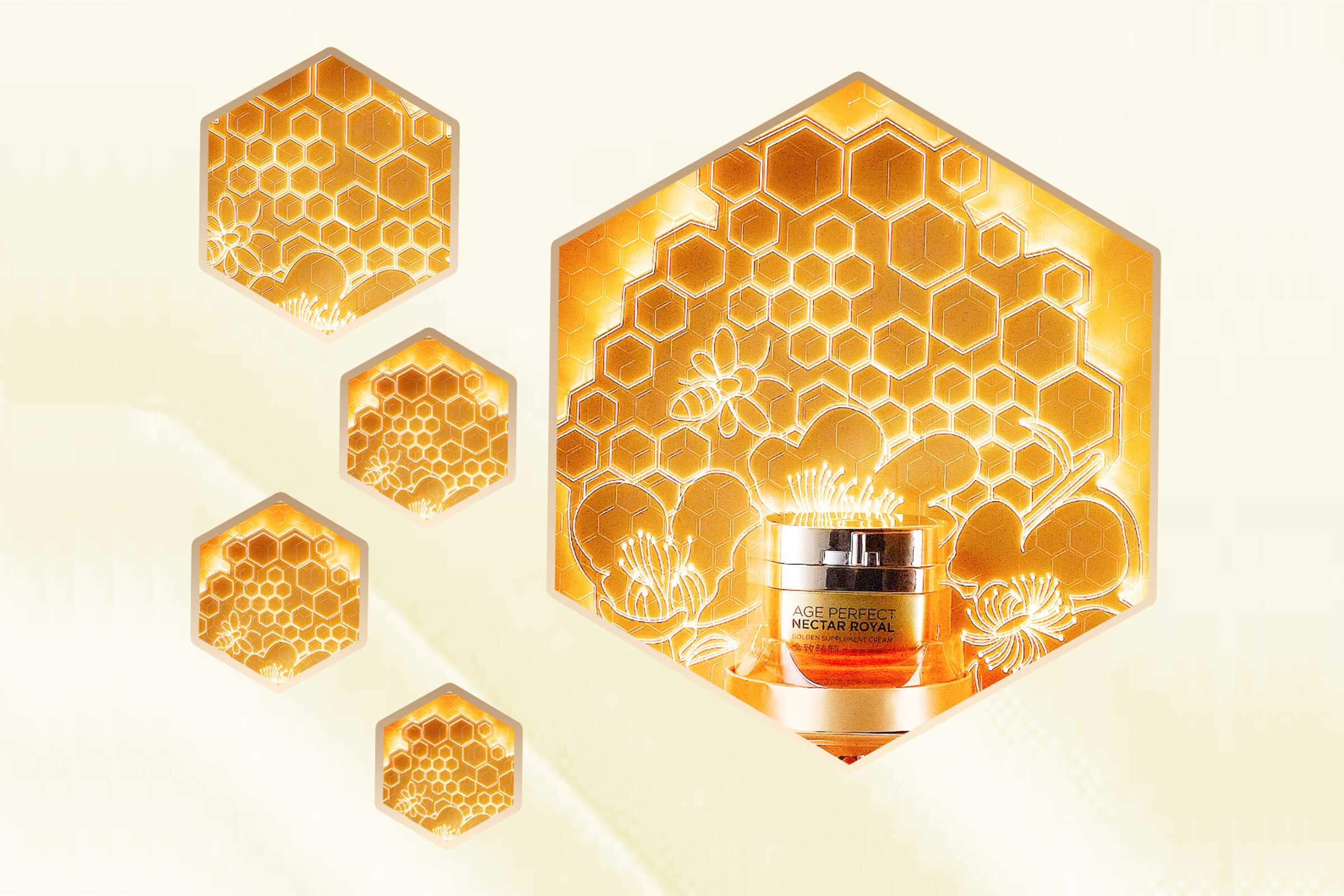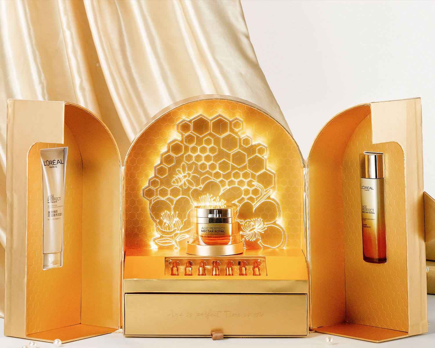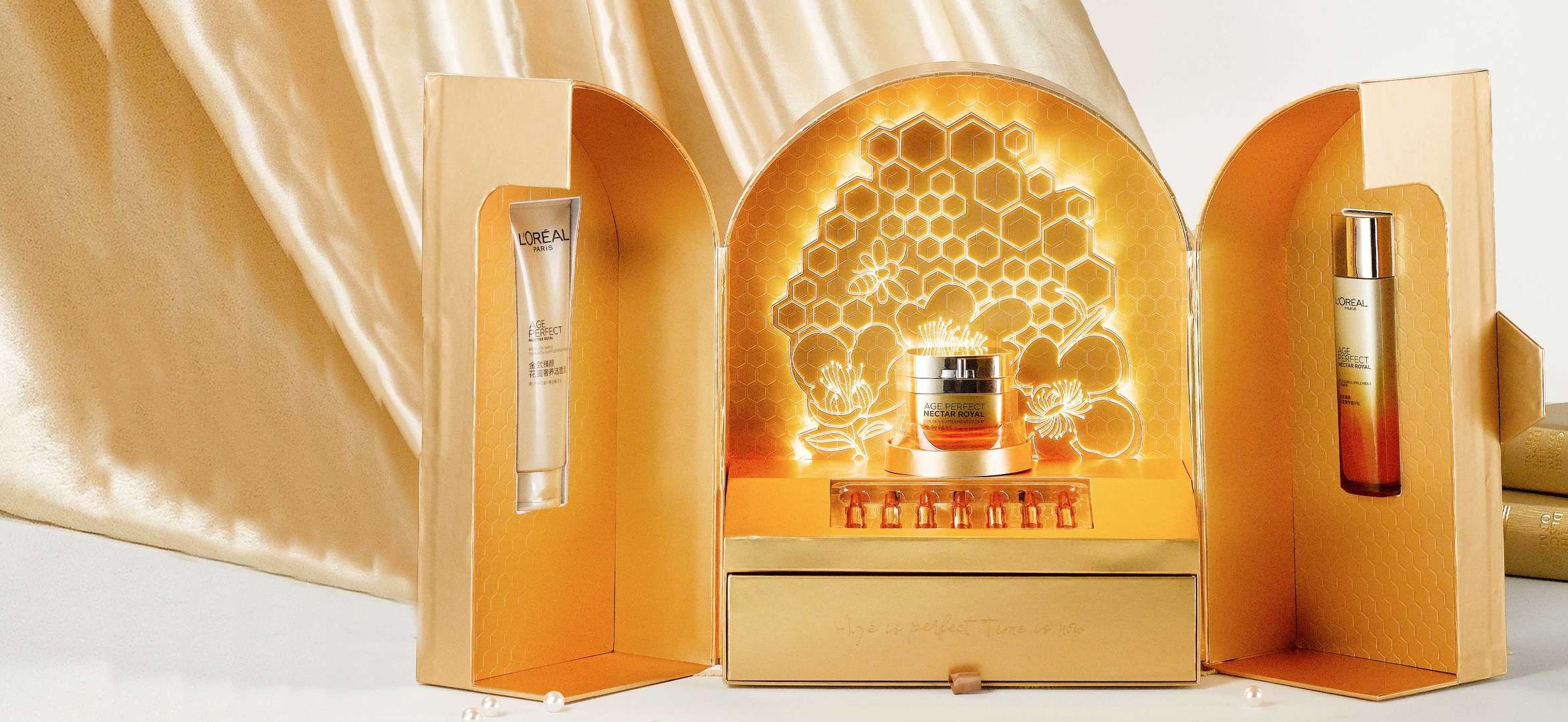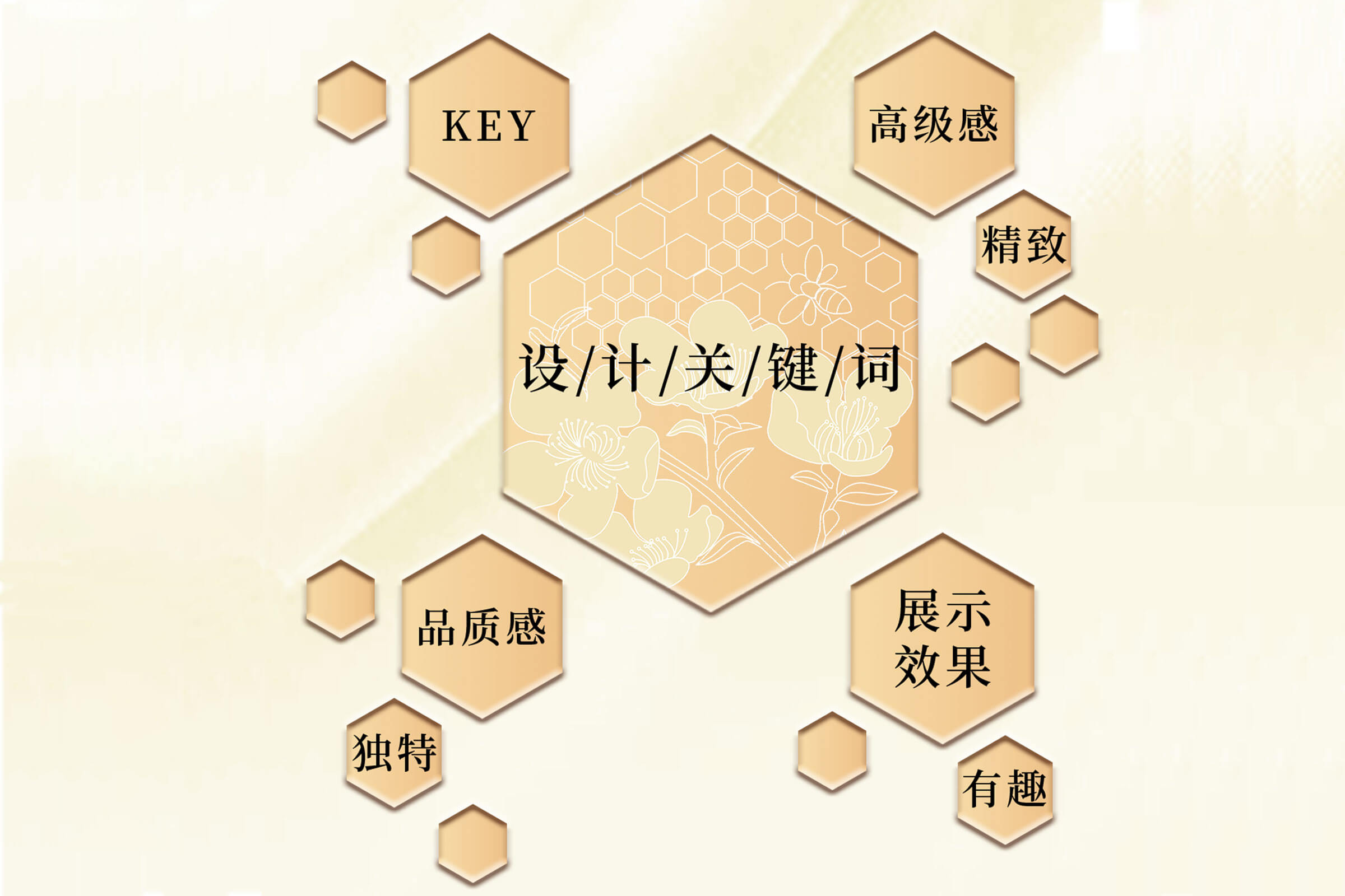 以蜂箱為靈感外盒,蜂巢線條勾勒圖形,彰顯產(chǎn)品高機(jī)能特性,細(xì)節(jié)豐富視覺,盡顯精致審美。宮廷風(fēng)格與燦金配色相映成趣,圓潤弧度外殼充滿期待之力。內(nèi)藏高顏值產(chǎn)品與細(xì)膩設(shè)計,蜂巢圖案融合麥盧卡花與蜂蜜,燈光映照下,展示效果絕佳。