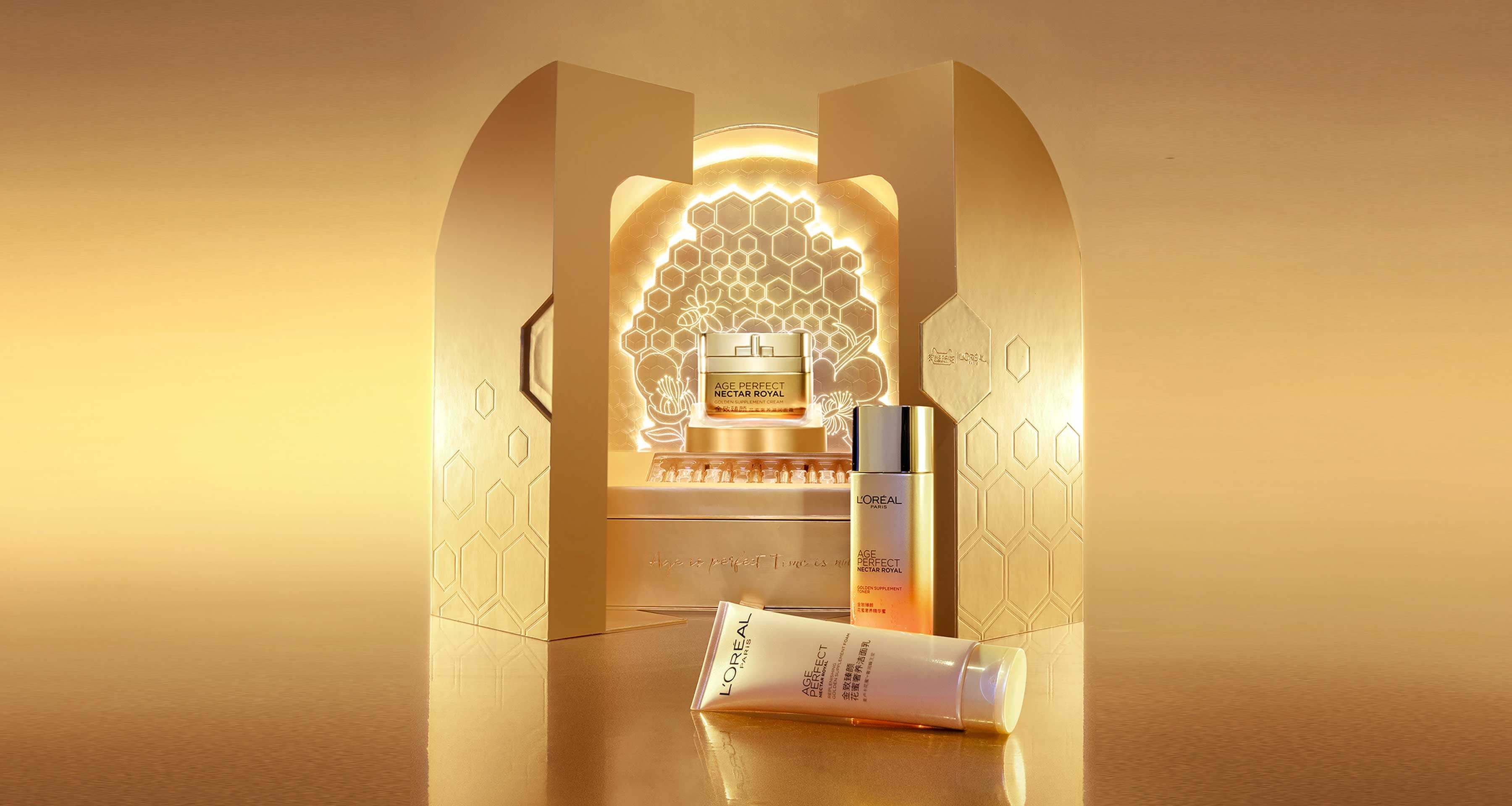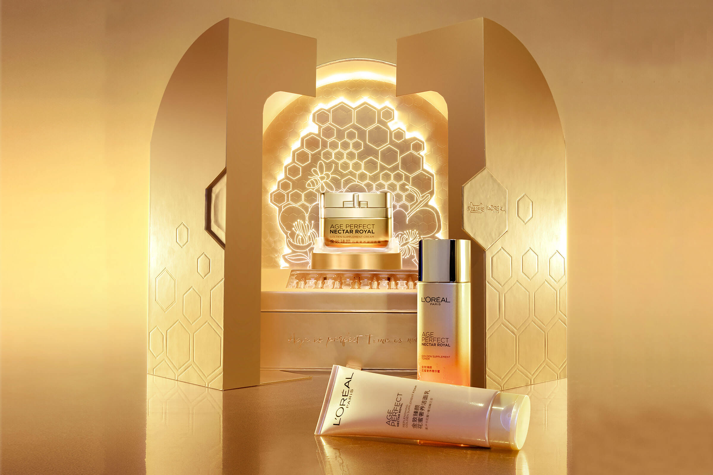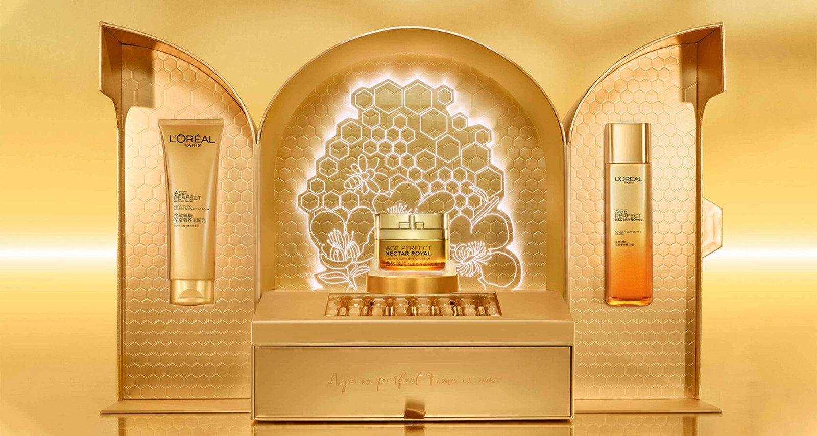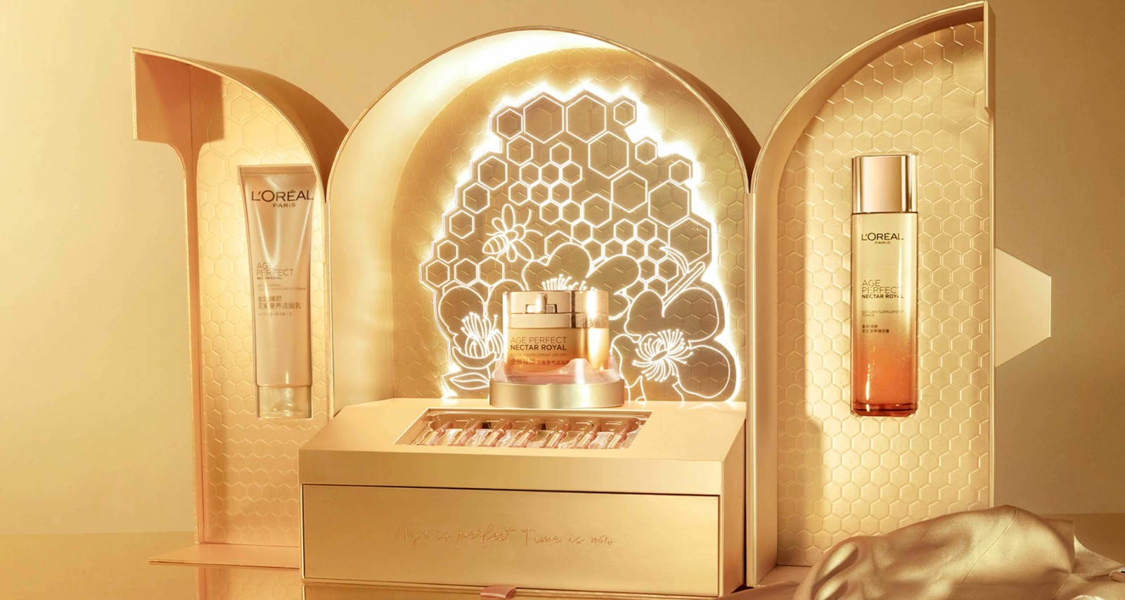 以蜂箱為靈感外盒,蜂巢線條勾勒圖形,彰顯產(chǎn)品高機(jī)能特性,細(xì)節(jié)豐富視覺,盡顯精致審美。宮廷風(fēng)格與燦金配色相映成趣,圓潤弧度外殼充滿期待之力。內(nèi)藏高顏值產(chǎn)品與細(xì)膩設(shè)計,蜂巢圖案融合麥盧卡花與蜂蜜,燈光映照下,展示效果絕佳。