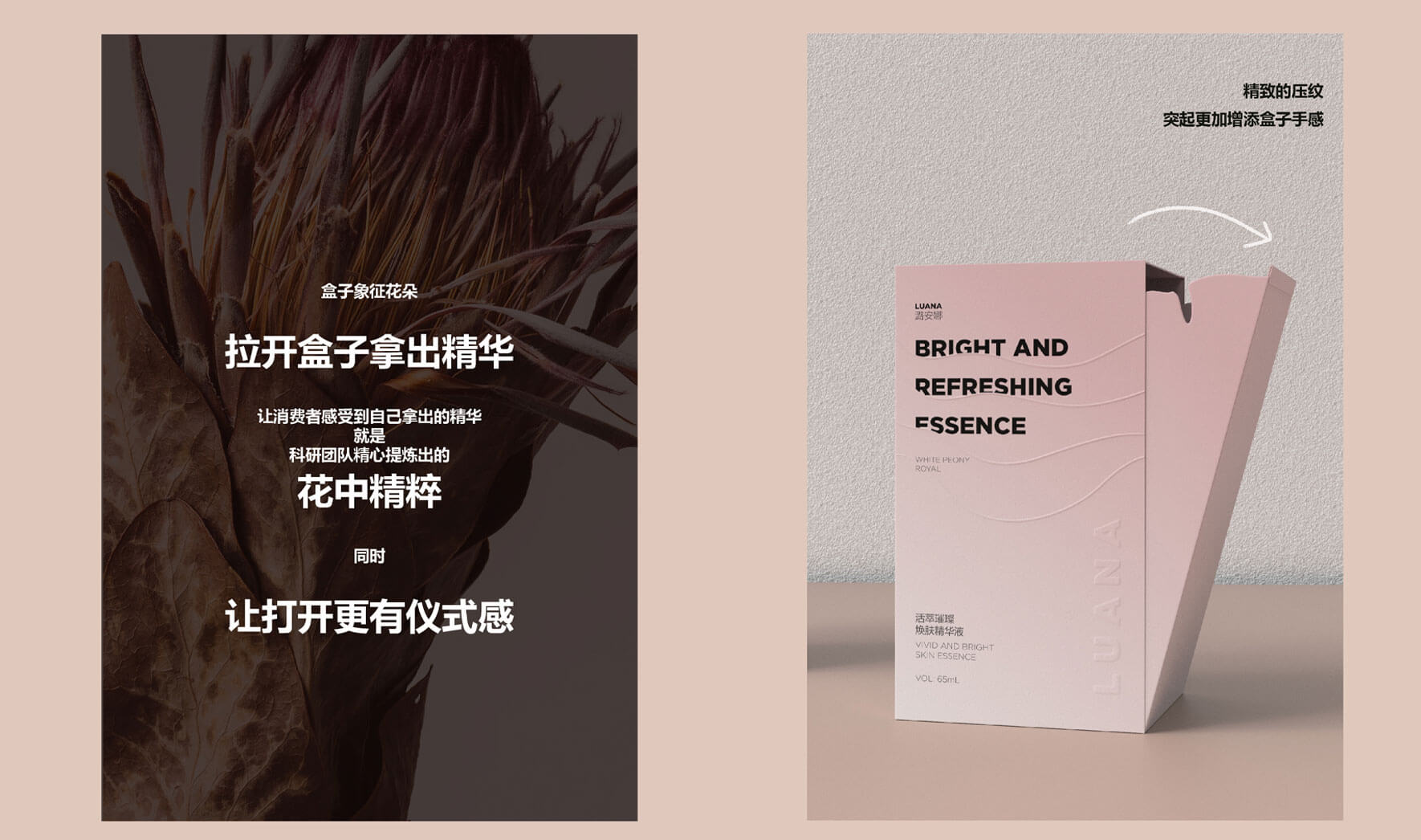 盒子象征花朵拉開盒子拿出精華,讓消費者感受到自己拿出的精華,就是科研團隊精心提煉出的花中精粹,同時讓打開更有儀式感,精致的壓紋凸起更加增添盒子手感。