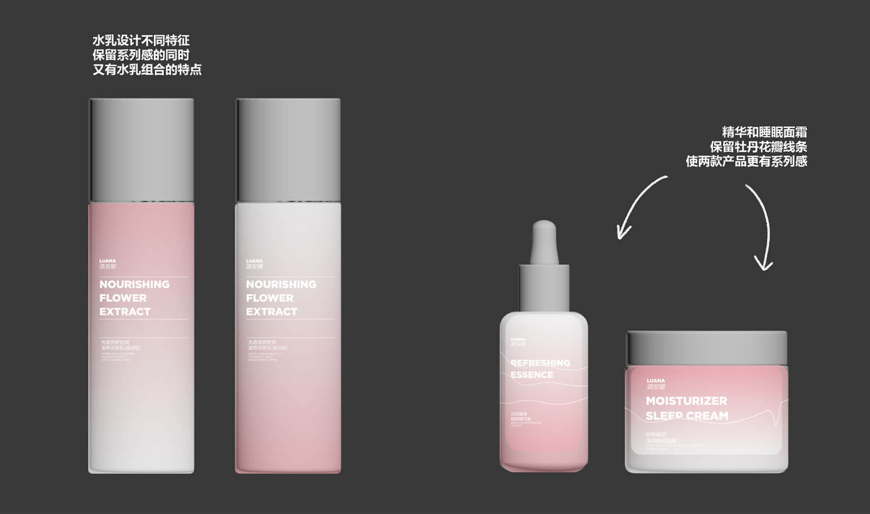 潞安娜主打產品精華和乳液,時尚簡約磨砂質感更顯高級。水乳設計不同特征,保留系列感的同時,又有水乳組合的特點。精華和睡眠面霜,保留牡丹花瓣線條,使兩款產品更加有系列感。