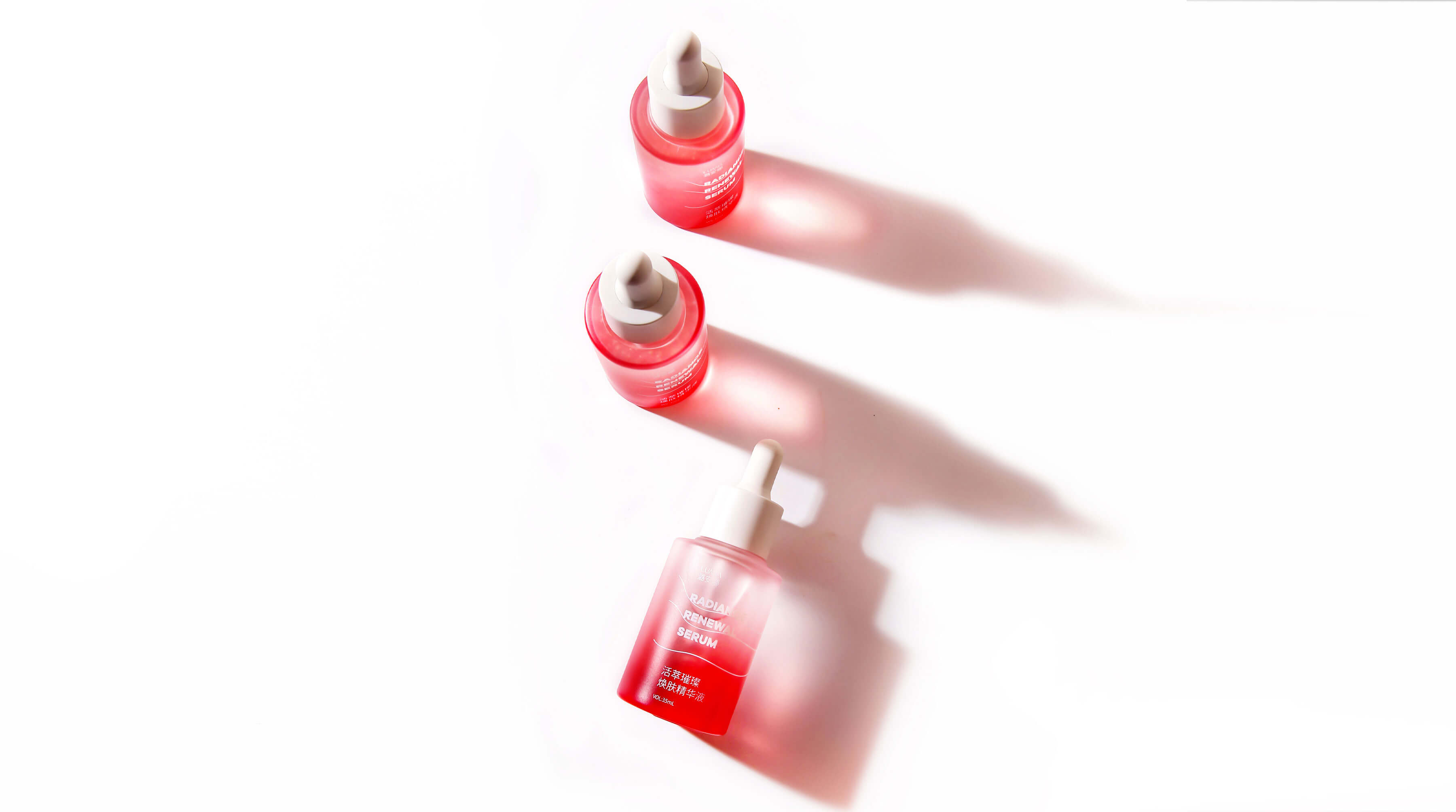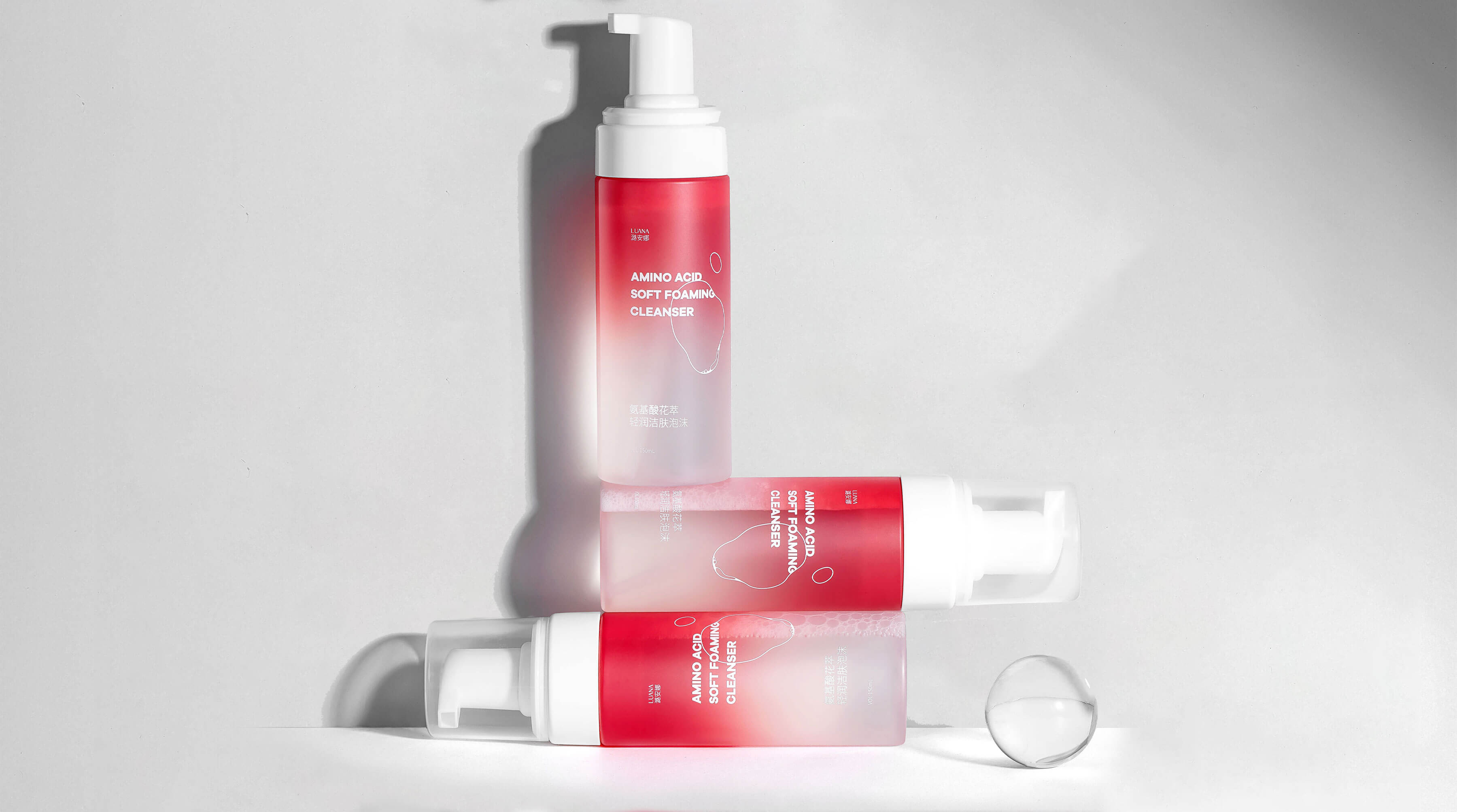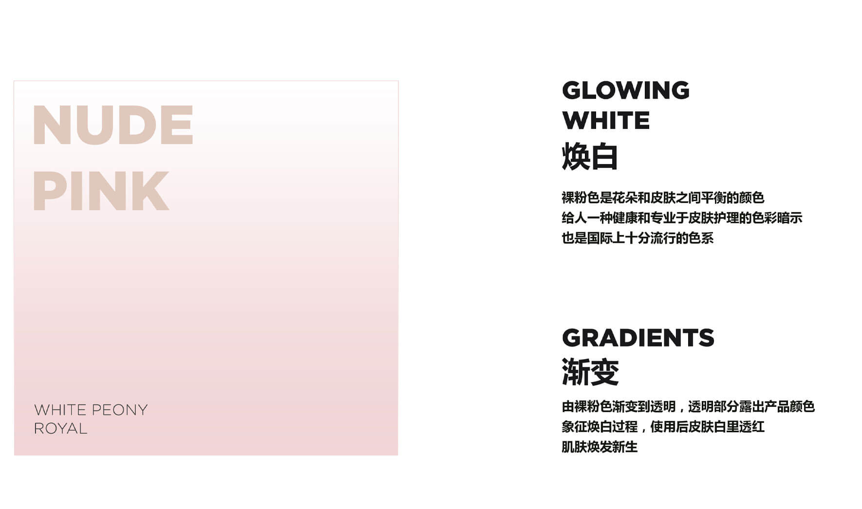 裸粉色是花朵和皮膚之間平衡的顏色,也是國際上十分流行的色系,給人一種健康和專業(yè)于皮膚護理的色彩暗示。由裸粉色漸變到透明,透明部分露出產品顏色象征煥白過程,使用后皮膚白里透紅肌膚煥發(fā)新生。