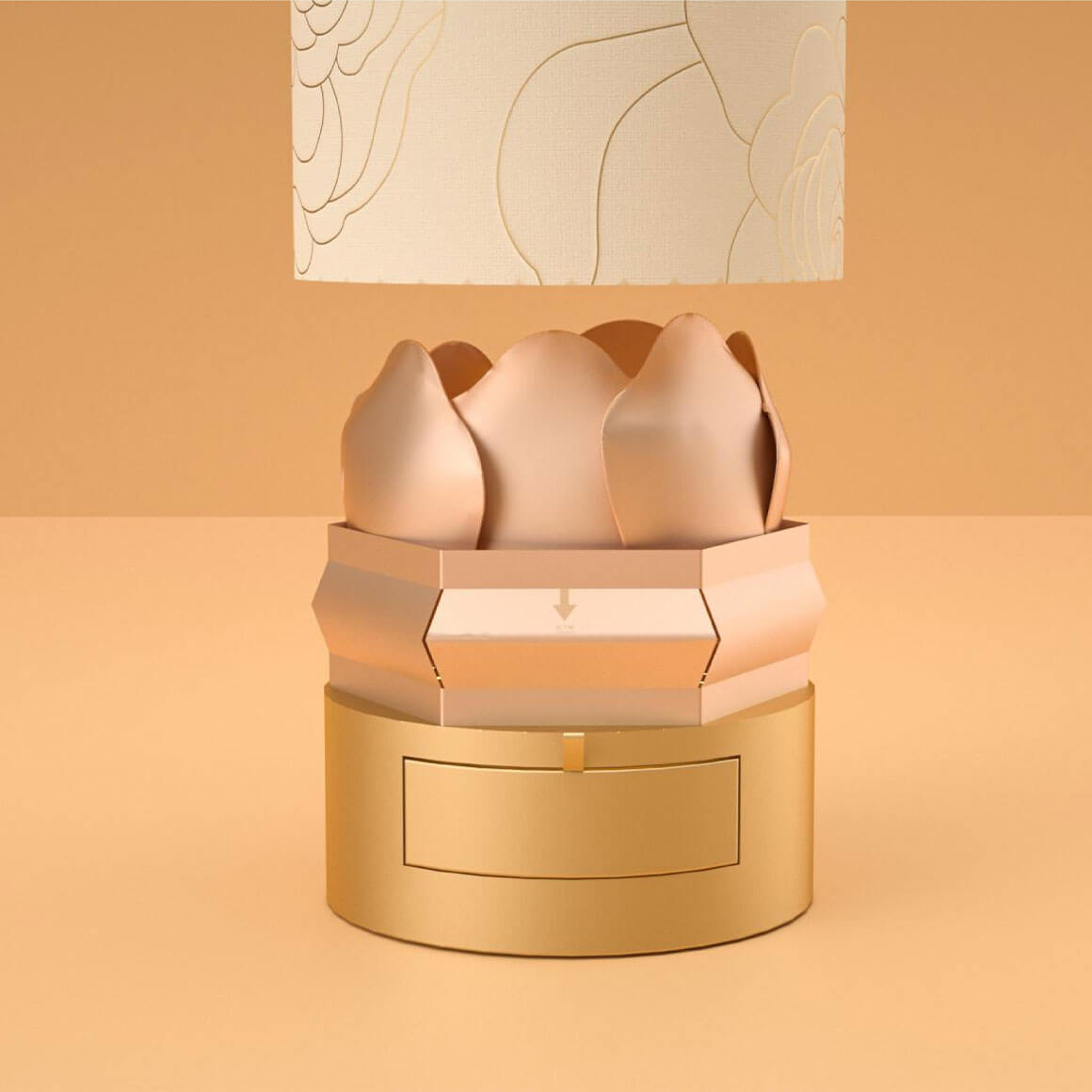 設(shè)計(jì)理念源于對(duì)奢華、尊貴與科技的深度解讀。我們以圓形盒型為基礎(chǔ),線條流暢、簡(jiǎn)約大方,既符合現(xiàn)代審美,又能凸顯出產(chǎn)品的尊貴與高雅。在色彩選擇上,采用經(jīng)典的金色作為主色調(diào),代表著奢華與尊貴,又能吸引消費(fèi)者的目光。