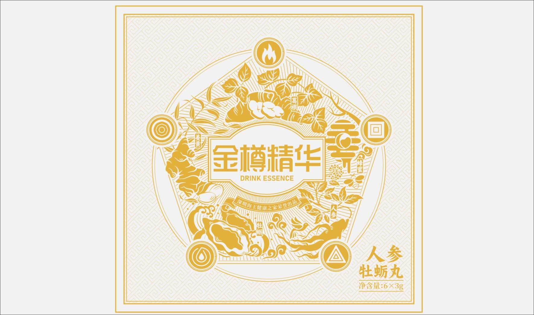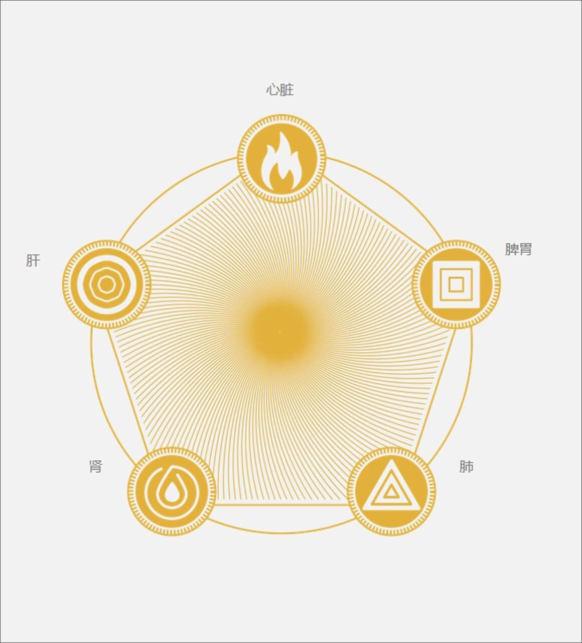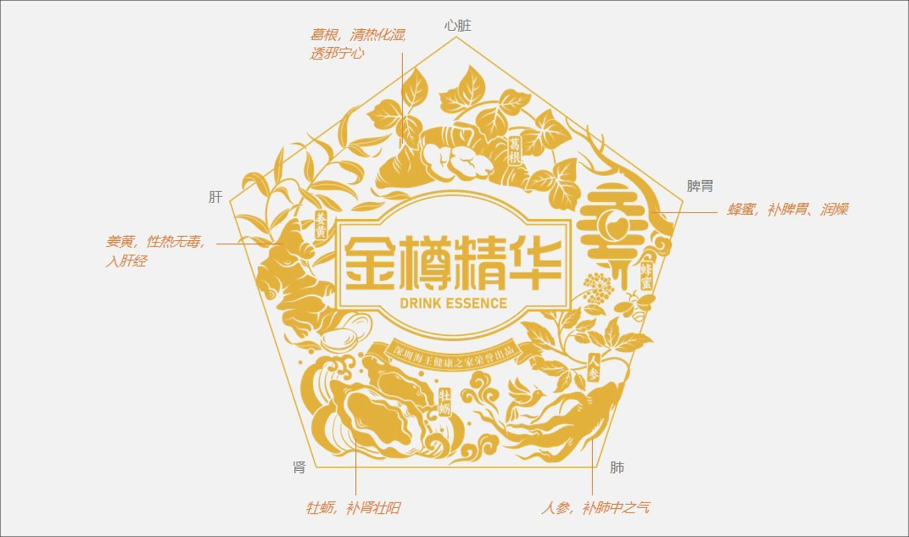 將“金樽精華”的藥材成分元素提煉與“五行”圖案融合,各藥材位置與五行對(duì)應(yīng)五臟的方位與相對(duì)應(yīng)。