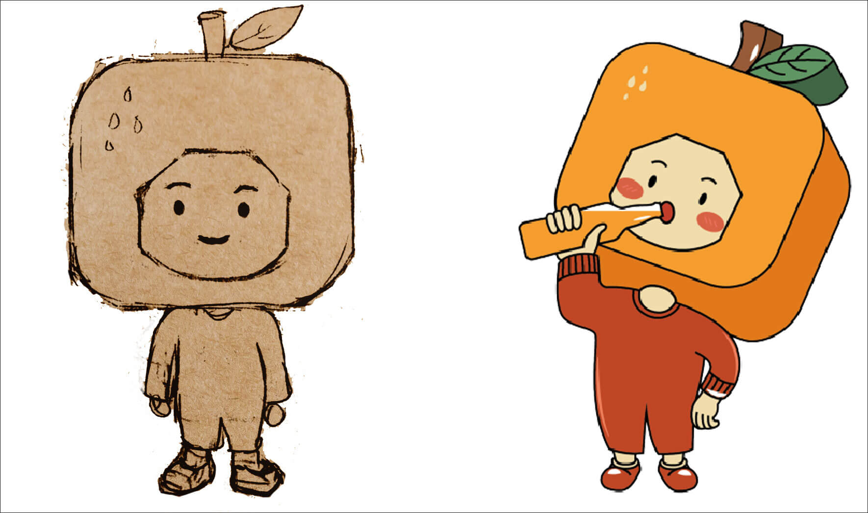 整體IP形象是一個(gè)戴著水果頭套,身穿連體衣喝汽水的造型。頭大身小看起來(lái)更顯萌態(tài),頭套后期可延展性強(qiáng),方形水果與市面形成差異化。色彩方面采用苔綠+米黃的配色。